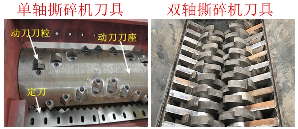 二、內(nèi)嵌主軸刀盤不太一樣,單軸撕碎機(jī)刀具主要是靠安裝在軸凹型孔里的刀粒,通過轉(zhuǎn)動刀軸上的單軸刀和w型齒形刀相對切剪把物料撕碎,特點就是快。